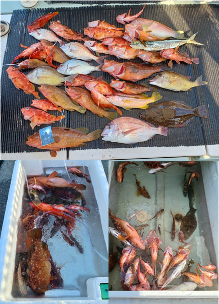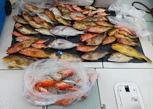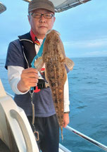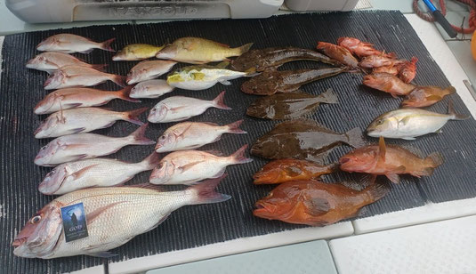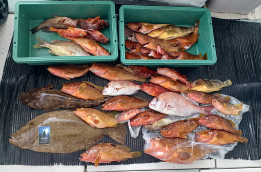本日の大物は70㎝弱ほどのヒラメ・デカアコウ・カサゴ・鬼カサゴ・アヤメカサゴ・フエフキダイ・真鯛…